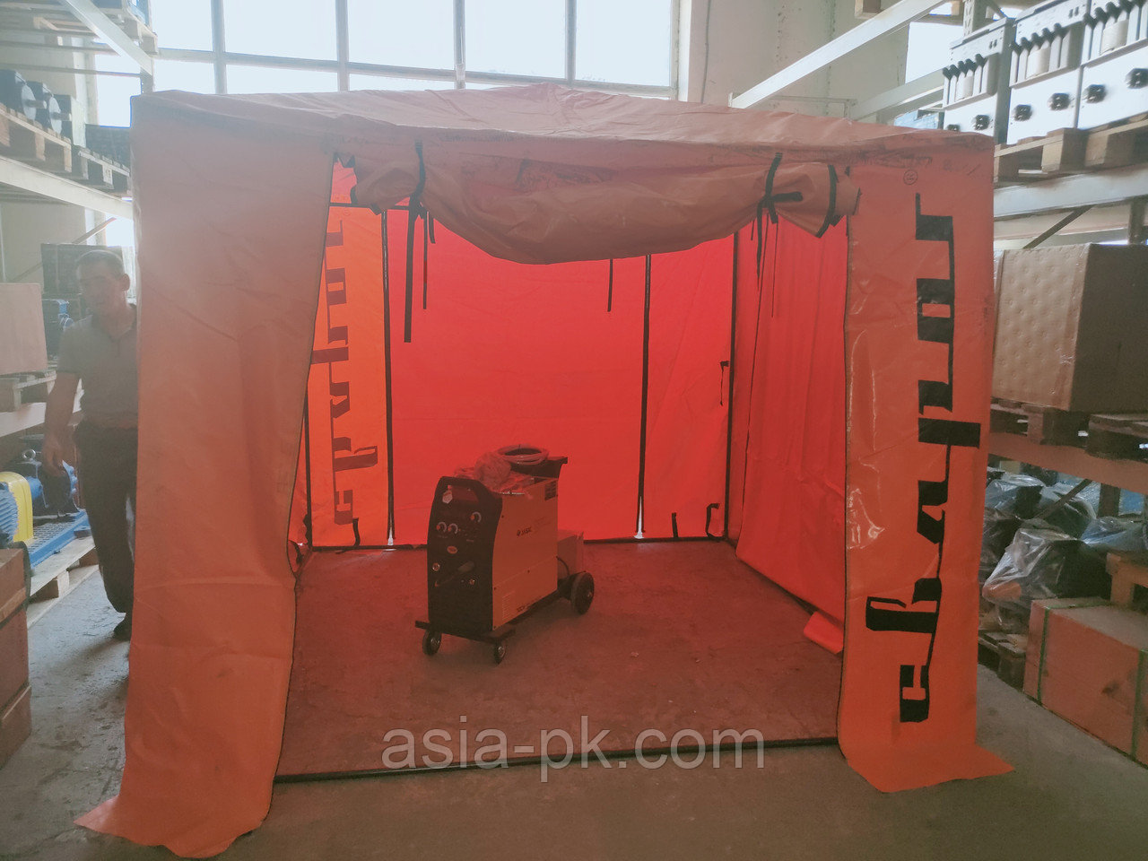 Палатка сварщика используется для выполнения сварочных работ в тяжелых погодных условиях. Основой палатки используется тяжелый металлический каркас, который выкрашен в 2 цвета для удобства сборки.